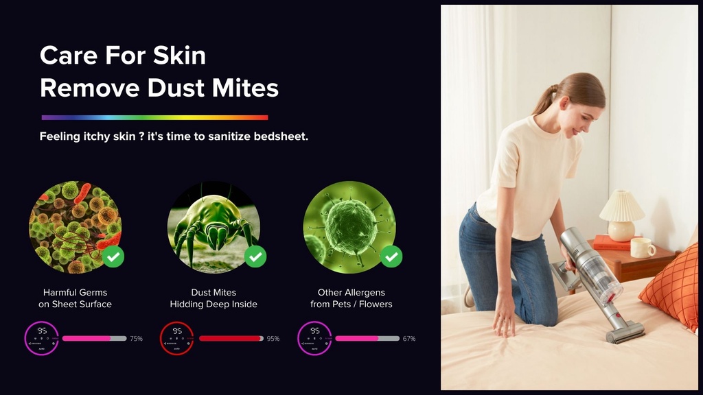 Experience next-level suction performance for deep, thorough cleaning on all surfaces, pulling out invisible tiny particles hidden in gaps.