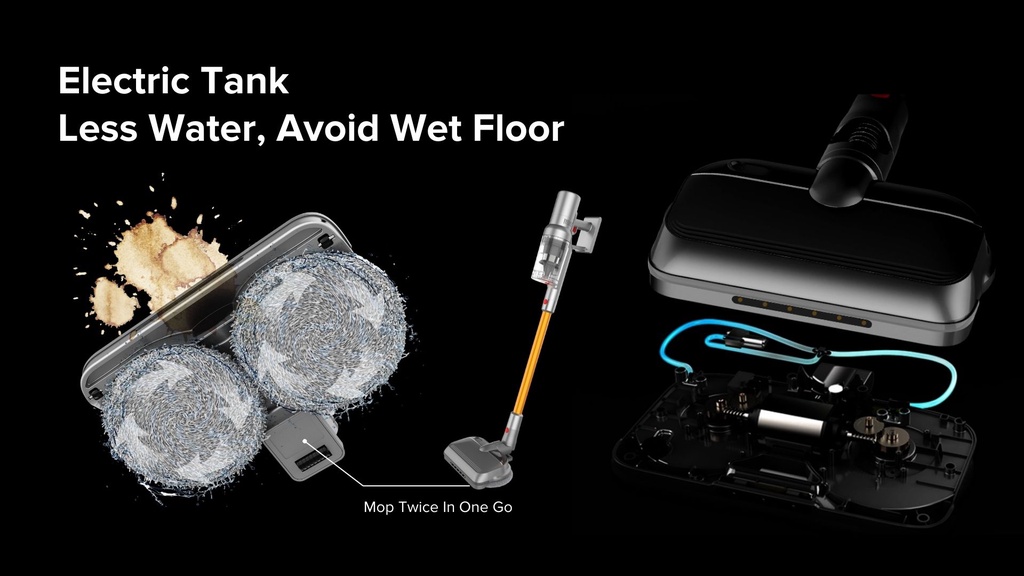 Achieve truly deep cleaning of stubborn food and drink stains with a system that includes precise digital water control from the tank, ensures optimal moisture levels to prevent overly wet floors, and dual spinning rollers for 100% efficiency improvement by mopping twice in one go.