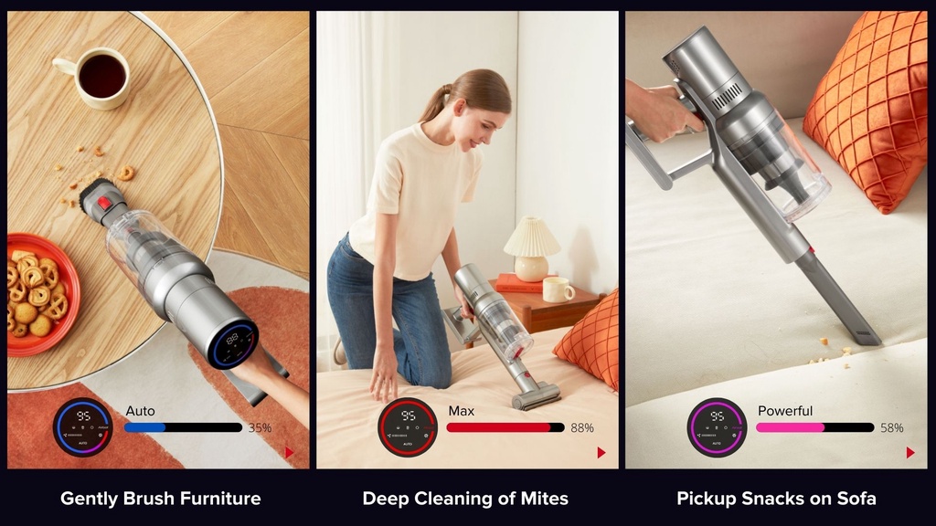 Instantly see your vacuum speed and battery level on the colorful LED touch screen, and visualize the cleaning process as the LED display ring light transits from red to blue. Easily switch between Auto and Manual modes with touch screen controls.