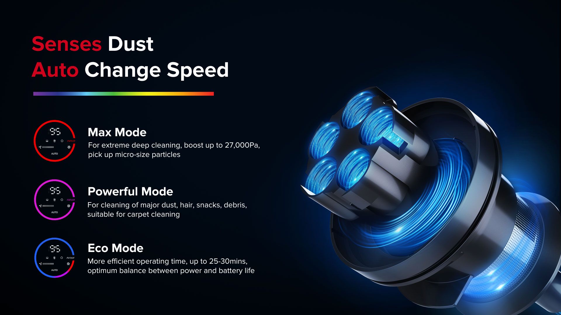 Intelligently adapt motor speed to the optimum level, detecting micro-size particles to smartly boost power automatically.